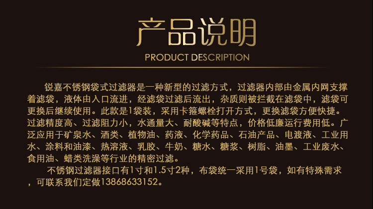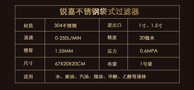 銳嘉不銹鋼袋式過濾器是一種新型的袋式過濾器,可過濾水、柴油、酒精等各種液體,布袋統(tǒng)一采用1號,袋如有特殊需求,可聯(lián)系我們定做。